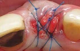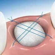 › El tejido blando circundante se sutura sobre la membrana con puntos en cruz.